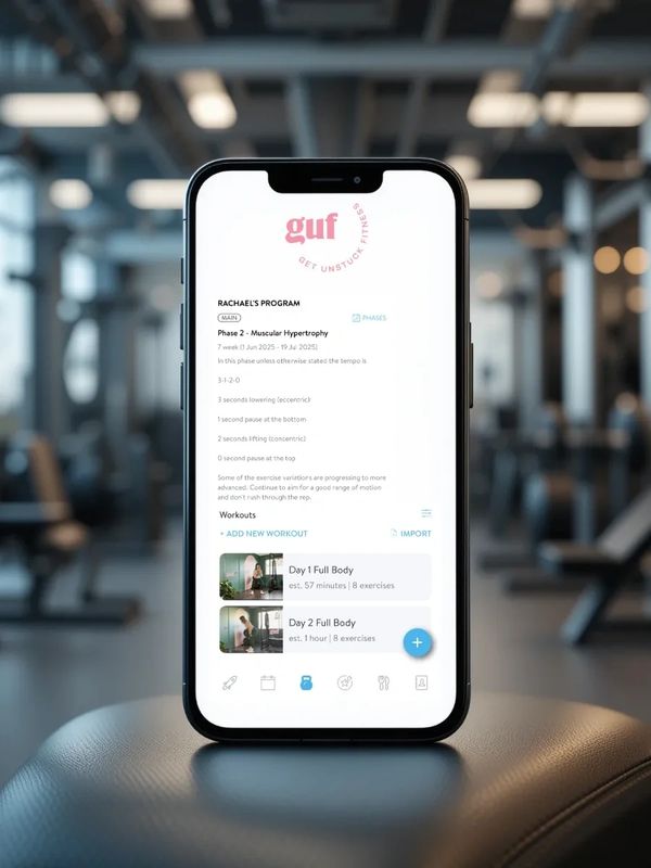 Access and record all your workouts in one place. Your program includes clear video and text instructions for every exercise. Track sets, reps, weight, rest, and more—directly in the GUF App for seamless progress monitoring.